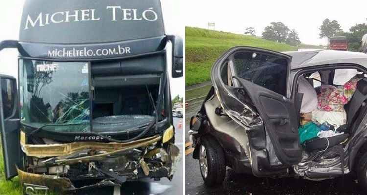 Pelo Facebook, Michel Teló lamentou. “Muito triste com esse acidente que aconteceu hoje (...). Nossa vida é na estrada e nossas orações, sempre são pra pedir proteção. Infelizmente o carro que vinha em outra direção, na chuva, perdeu o controle, atravessou a pista e bateu de frente com nosso ônibus, que estava na terceira pista da direita. Não tenho palavras pra descrever meu sentimento de tristeza, e pesar”, escreveu o cantor.
